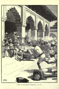 রাজার ঘরের দরজায় পাহারা দিচ্ছে কিছু ইংরেজ সৈন্য। এ ঘরে কে ঢুকবে আর কে ঢুকবে না সে ব্যাপারে ভীষণই কড়া নজর তাদের। মহলের সমস্ত কর্মচারীদের ভাল করে চিনে রেখেছে, তাদের ছাড়া অন্য কারও ঢোকার অনুমতি নেই। এমন সময় হঠাৎ কীসের শব্দে পাহারাদারদের কান সতর্ক হয়ে উঠল — প্রথমে মনে হল যেন মৌমাছির চাকে কেউ ঢিল ছুঁড়েছে, তাতেই ঝাঁকে ঝাঁকে মৌমাছি গুঞ্জন করছে। কিন্তু ধীরে ধীরে সেই গুঞ্জন তীব্রতর হতে হতে কোলাহলের চেহারা নিল। মহলের বাইরে প্রচণ্ড চেঁচামেচি হচ্ছে, একসঙ্গে অনেক লোকের কণ্ঠে হারে-রে-রে-রে-রে রবে মহলের ভিতর-বার গমগম করতে শুরু করেছে। কয়েকটা গোলাগুলির শব্দ শোনা গেল এবার। চঞ্চল হয়ে উঠল রাজার পাহারায় থাকা ইংরেজরা। ইন্ডিয়ায় এসে নেটিভদের আক্রমণে প্রাণ দিতে হবে — হে প্রভু যিশু, তা যেন না হয় — মনে মনে সকাতরে প্রার্থনা করতে লাগল তারা। এরপর হঠাৎ কোনো কিছু বুঝে ওঠার আগেই বাইরে পাহারায় থাকা ইংরেজ সৈন্যরা ছুটে ভেতরে চলে এল, তাদের মুখ চোখ আগুনের মত লাল হয়ে গেছে উত্তেজনায়। জানা গেল তাদের উপর হামলা হয়েছে। নেটিভরা ঘিরে ফেলেছে সমস্ত মহল, পাহারার বেষ্টনী ভেঙে তারা ভেতরে চলে এসেছে। বাঁচার উপায় বোধ হয় আর নেই।